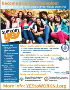 More details are available in this flyer. Hunterdon County businesses may contact Christina Shockley at 908-788-1119 or by email at yes@hcvsd.org. Somerset County businesses may contact Khuti Moses at 908-569-5401 or by email at kmoses@middleearthnj.org.